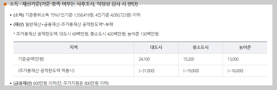 소득기준 중위소득 75 퍼센트 이하 4인기준 월 405만 723원재산 기준 중소도시 1억 5200만원 이하 ,금융 재산 600 만원 이하인 가구 입니다. 2023년 에는 중위소득 30프로 이하에 해당하는 금액을 지원 하고 있습니다.