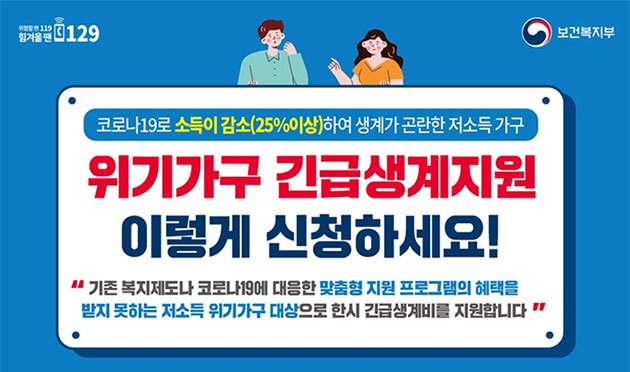 위기상황의 발생으로 생계유지 등이 곤란하게 된 저소득 가구와 대상자는 위기상황에 처한 사람으로서 지원이 긴급하게 필요한 사람입니다 국내에 체류하고 있는 외국인 중 다음의 어느 하나에 해당하는 사람이 긴급지원대상자 에 해당하는 경우에는 긴급지원을 받을 수 있습니다