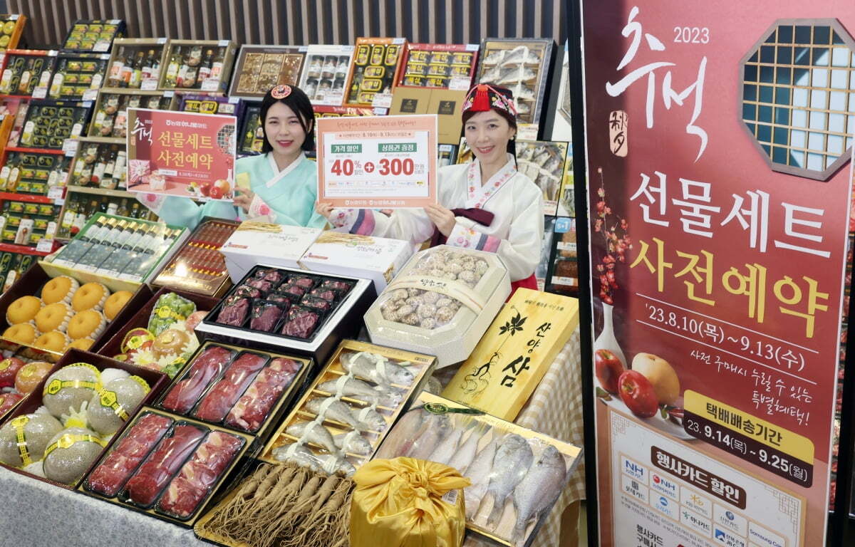 서울 서초구 농협 하나로마트 양재점에서 올해 추석 선물세트 사전예약 할인 행사를 홍보를 하고 있고요 농협 하나로마트는 10일부터 선물세트 사전 예약 구매 고객이 행사 카드로 결제하면 최대 40% 할인해 주고 금액별로 농촌사랑상품권을 300만 원까지 증정한다고 하니 사전예약하고 꼭 할인까지 받는 걸 추천합니다.