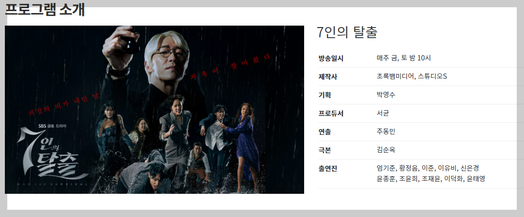 2023년 9월 15일부터 〈소방서 옆 경찰서 그리고 국과수〉의 후속으로 방영 중인 SBS 금토 드라마. 7인의 탈출 시리즈의 첫 번째 시즌이다.
