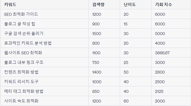 *이 표는 검색량과 난이도를 기반으로 기회 지수가 높은 키워드 10개를 보여줍니다. 이 키워드들을 사용하여 SEO 최적화된 블로그 글을 작성하는 데 도움이 되길 바랍니다.